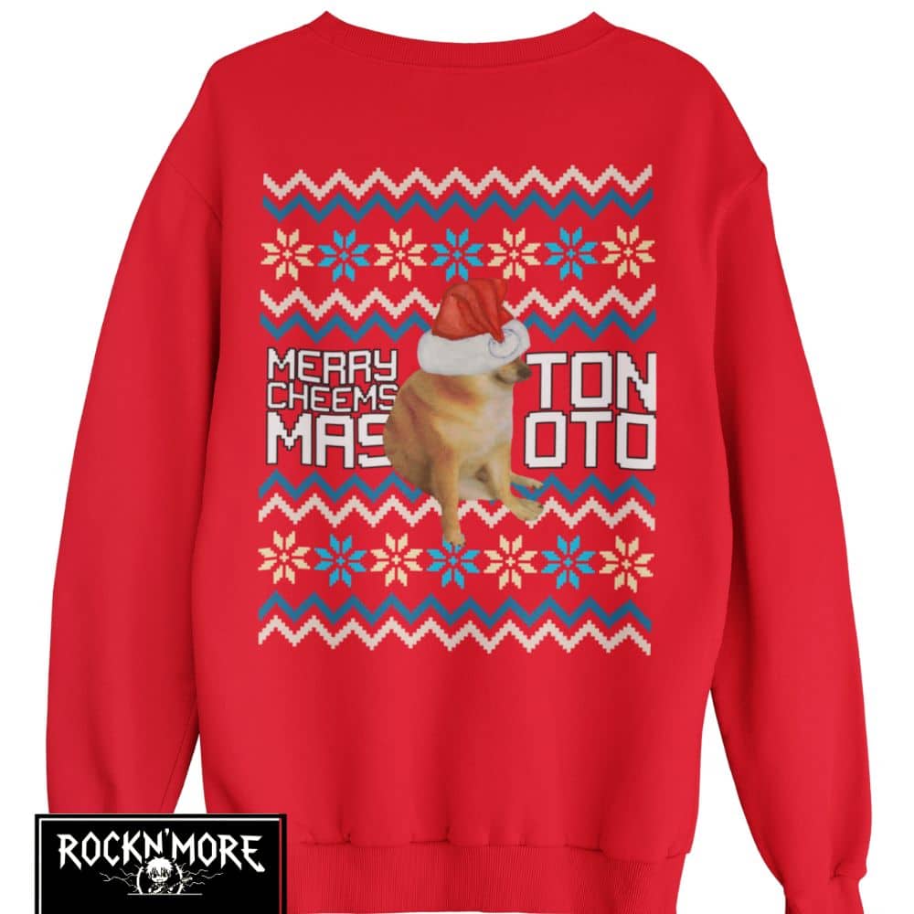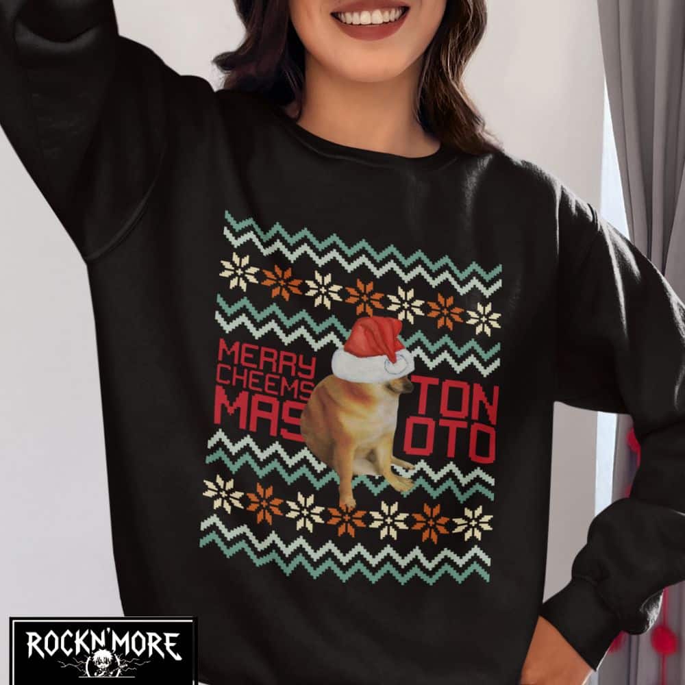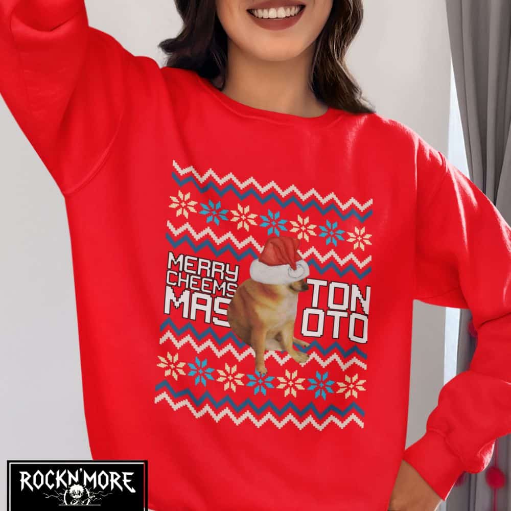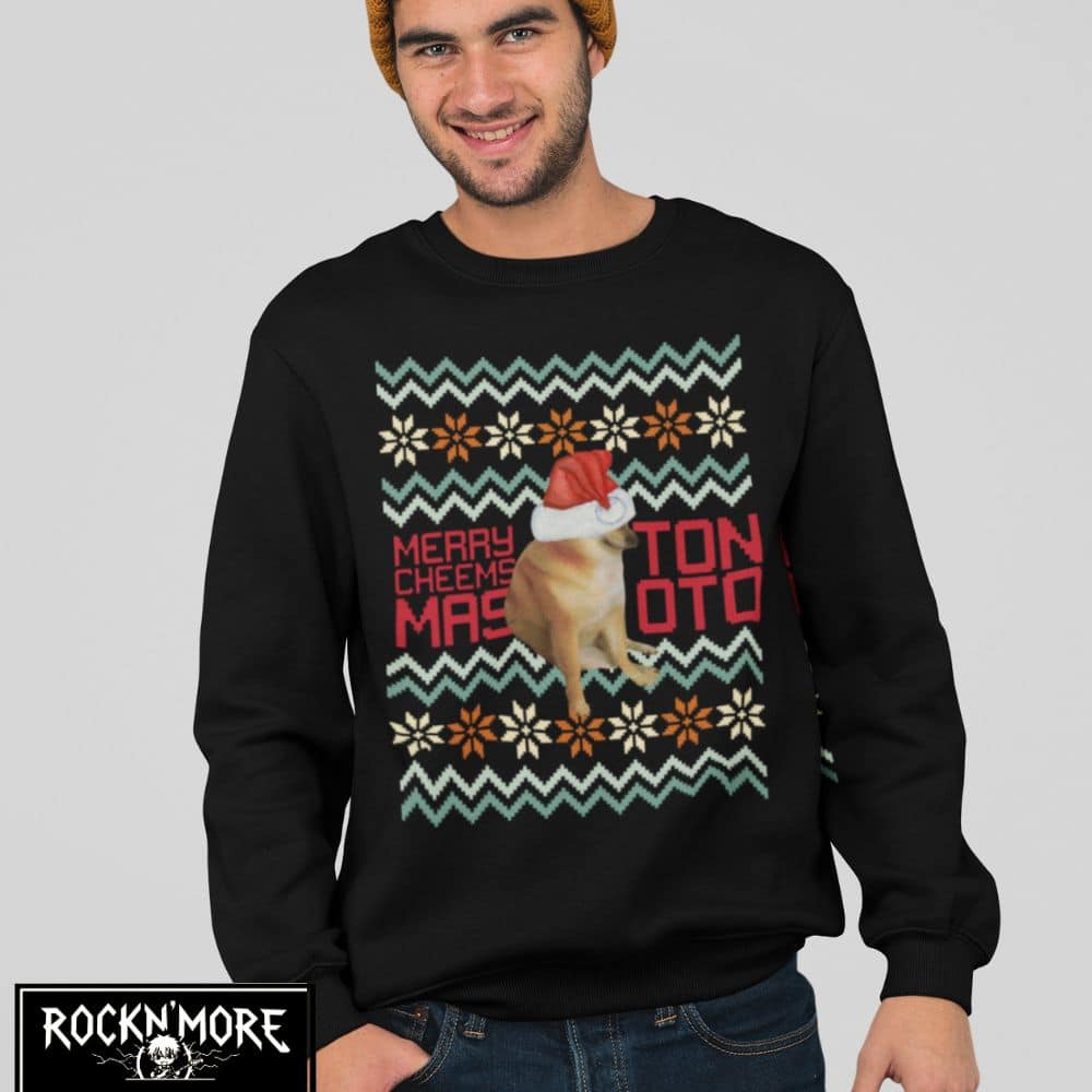 Este sweater es el tope del arte ugly-sweater: un Cheems vestido de Santa listo para dar guerra en cualquier intercambio navideño. Ideal para esos momentos cuando quieres que tu familia y amigos se sientan incómodamente fascinados por tus elecciones de moda. En resumen, es un festivo desastre lleno de amor navideño y pelajes caninos.